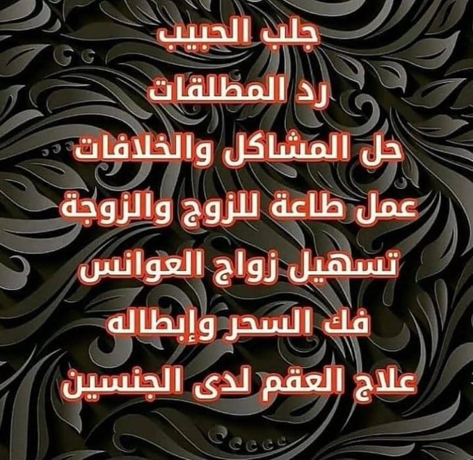 علاج السحر بالقران الكريم علاج العقم علاج العين الحسد المس اللمسه الارضيه المس الشيطاني علاج جميع انواع الاسحار السفليه الارضيه العلويه حل تاخر الانجاب فك المربوط علاج الامراض المستعصيه علاج الامراض التي لا تعرف مما اصابتك ولم تجد لها اى تحليل او سبب علاج الامراض المستعصيه ولله الحمد توصلنا لعلاج السرطان القنصر والعديد من الامراض التي لا علاج لها بالطب الجسدي فبالقران الكريم والرقيه الشرعيه لله الحمد اكرمنا الله فى المساعده في العلاجات سعدنا أن نعلن للجميع عن بعض من الخدمات التي يتقدم بها فضيلة الشيخ بأمر الله تعالى نقدم المساعده فى علاجات العديد من الأمراض النفسيه والباطنيه وغيرها من الامراض التى لا تندلع تحت مسمي طبي أى تشخيص طبي . كالسحر والصرع والمس الشيطاني والعين والحسد والاسحار السفليه العلويه والارضيه علاج العقم علاج الامراض المستعصيه كالسرطان علاج الامراض الجلديه ومعظم الامراض العضويه عن طريق الاعشاب والزيوت الطبيعيه وبأمر الله تعالى نقدم العديد من الفوائد استخدام لتسخير قلوب الناس بالمحبة والقبول . استخدام لزواج البنت المتعسرة عن الزواج . استخدام لجلب الحبيب في 48ساعة للخطوبة والزواج . استخدام للدفائن والكنوز كشف واخراجها .استخدام لعدم زواج الزوج علي زوجته .استخدام للعزة والكرامة والتحصن من السحر. استخدام لدفع الخصوم. استخدام في القبول والجاه عند الناس.استخدام لقضاء الحوائج.استخدام في عقد الألسنة .استخدام للحفظ من الأعمال الشيطانية . استخدام للقضاة وأرباب المناصب والمسؤولين. استخدام لجلب الزبون . فائده لجلب الرزق في البيع والشراء. فائده في المحبة بين الزوجين استخدام في علاج المربوط عن النساء ، استخدام في إبطال سحر المعقود ومتخصصــون بأمر الله فــــــي جلــب الحبيب خلال 48 ساعه بمعني : جلب وخطف عقل وجسد وروح الحبيب الى حبيبته او العكس لكن من الشروط اللازمه للاتمام ان تكون النيه الحلال لانه جلب للخطوبه والزواج وليس للتهريج لا سمح الله